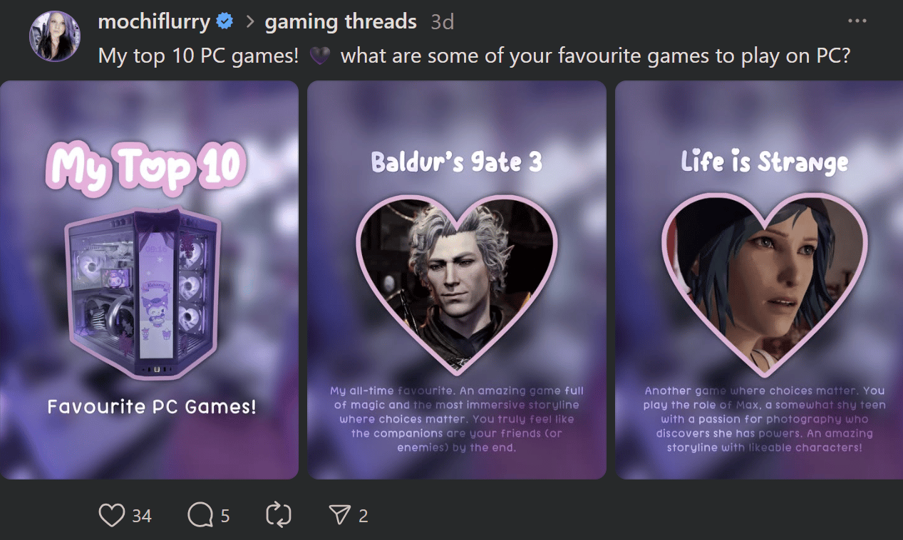 Bright colors and/or pretty images attract your gaze, while the texts are here to make you stay on the creator's post a lot longer.